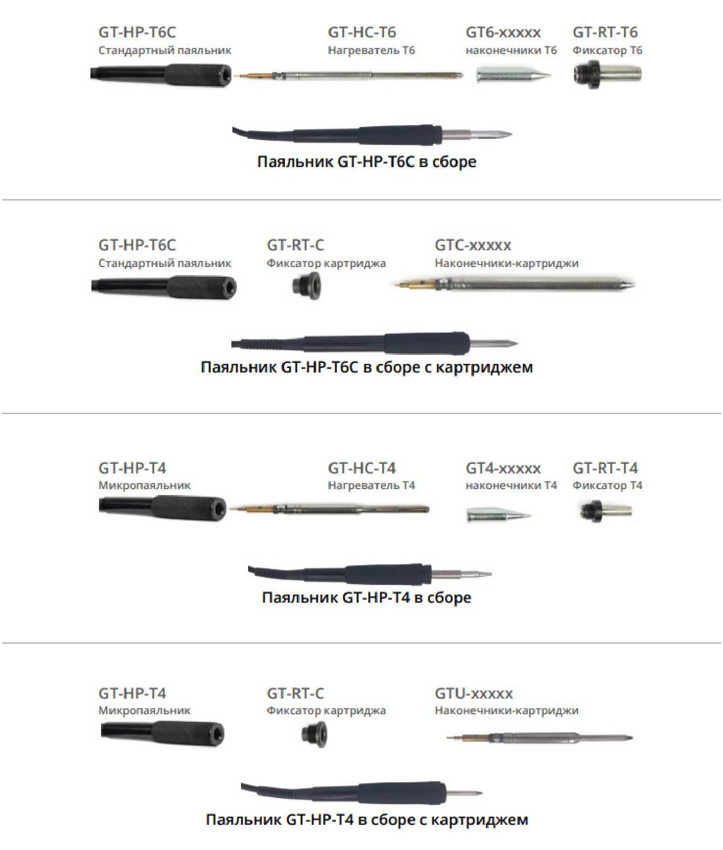 Два паяльника двух размеров. В каждый можно вставить наконечник-картридж с максимальной теплопередачей или раздельные жала и нагреватель.